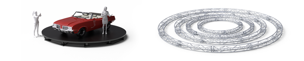 Whether your team needs rotating stages for a vehicle revolve or an extra-large decorative circle truss hung over your exhibit booth, we've got you covered. Ask about our hard-to-find, proprietary, heavy-duty, and special event staging hardware.