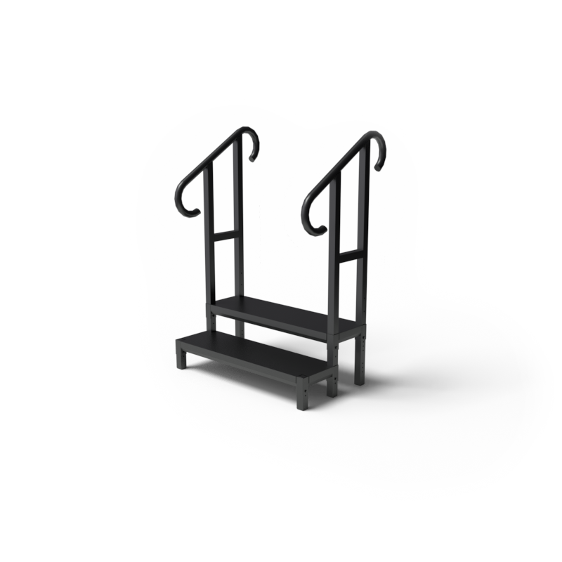 Our single stage step with handrails provides a secure solution for low-set stages requiring a regulation-based step between. Built with a durable steel frame and non-slip treads, the stairs adjust to multiple height settings and steps stay aligned with the ground, making them ideal for modular stage systems. Designed for concerts, corporate events, and theatrical productions, these stairs offer safety, reliability, and a professional appearance.